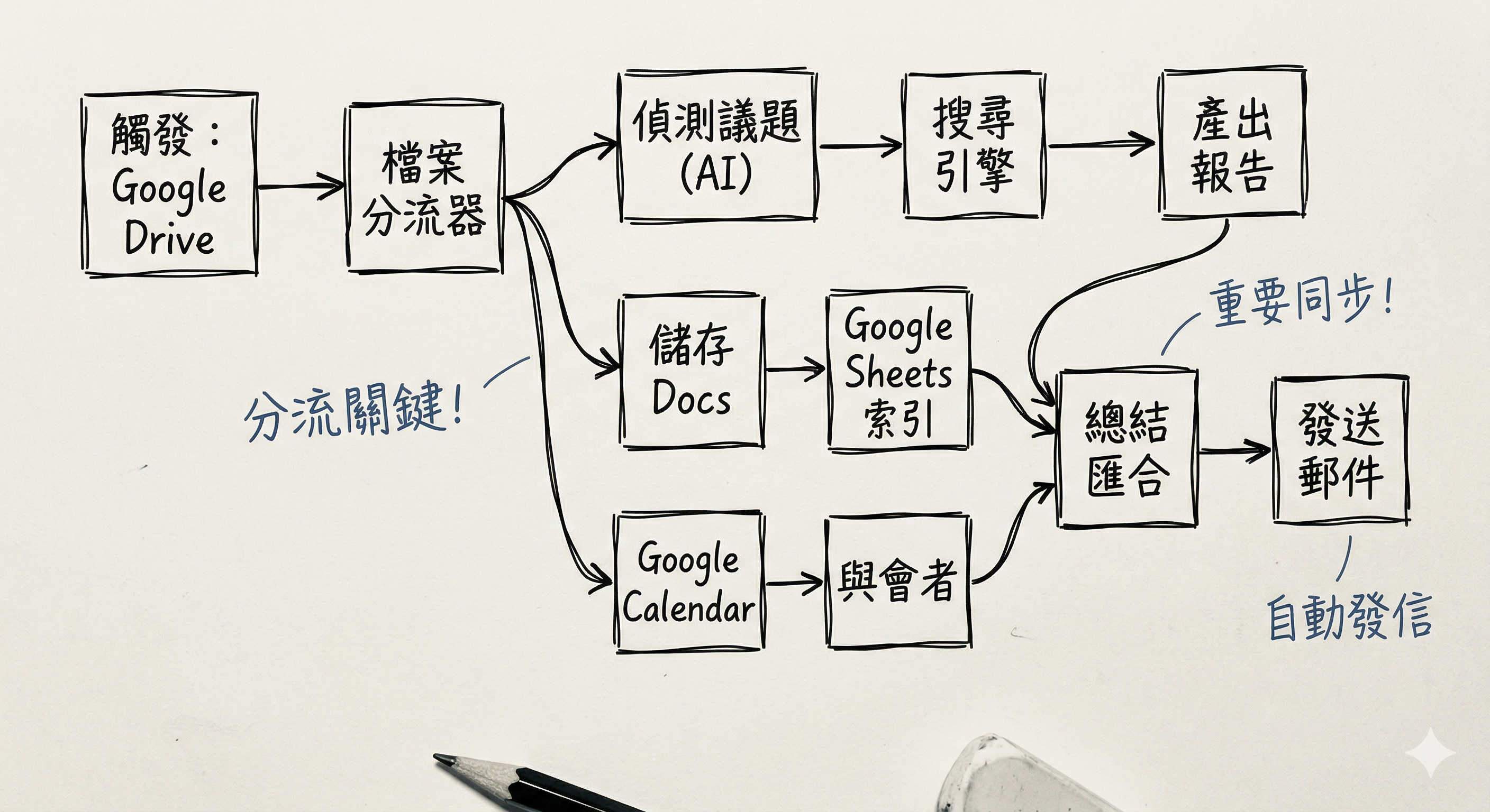 This project aims to eliminate the "time-consuming and repetitive" pain points of meeting documentation. By integrating Google Workspace and OpenAI via n8n, I developed an end-to-end automated workflow covering file detection, meeting summarization, research report generation, and participant-targeted emailing.