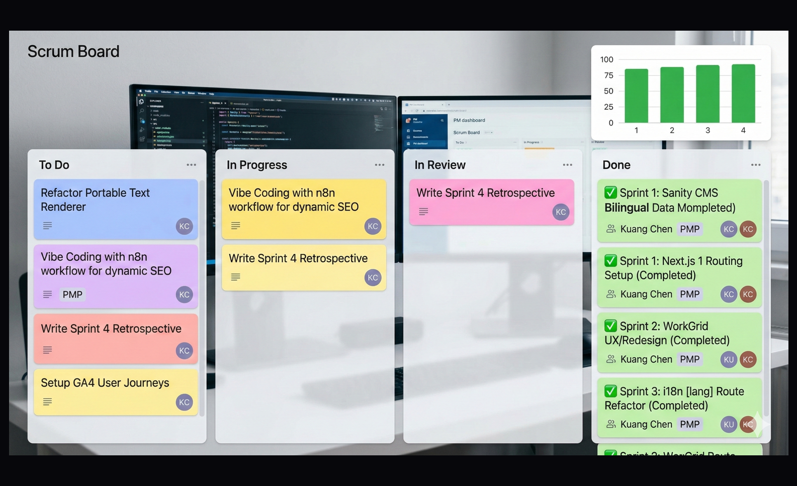 這不只是一個作品集網站,這是一場「元專案 (Meta-Project)」實驗。我在 Next.js 15 架構下,利用 Scrum 實踐,協同 AI (Windsurf) 進行高效開發。